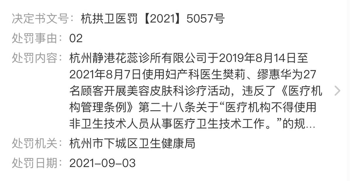 2021年9月3日,杭州静港花蕊诊所有限公司于2019年8月14日至2021年8月7日使用妇产科医生樊某、缪某华为27名顾客开展美容皮肤科诊疗活动,违反了《医疗机构管理条例》第二十八条关于“医疗机构不得使用非卫生技术人员从事医疗卫生技术工作。”