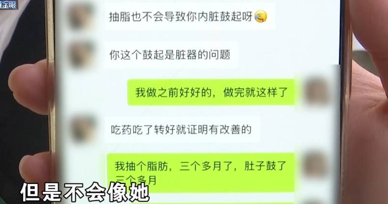 记者报道,几个月前,小孟做了吸脂手术,她说本来是想让自己的腰腹变小,没想到做完不久肚子反而鼓了起来,她觉得是做手术导致的。