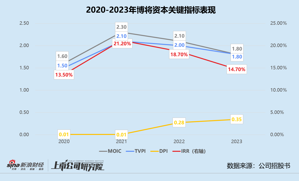 以上种种,导致博将资本的多项关键指标恶化。2021-2023年,公司的内部收益率(IRR)和剔除基金管理费后的净内部收益率(Net IRR)双双呈下降趋势,分别由21.2%降至14.7%、由20.0%降至13.4%。项目层面的投资收益倍数(MOIC)和基金层面的总投资倍数(TVPI)也持续缩水,2023年两项指标较2021年分别减少21.7%、14.3%。