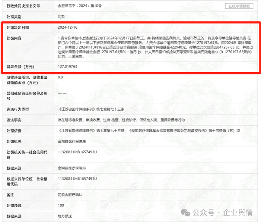 据“信用江苏”官网载明:2024年12月16日,金湖县医疗保障局作出金医保罚﹝2024﹞第10号处罚决定书,金湖县人民医院存在超标准收费、串换收费、过度 检查、过度诊疗、低标准入院、重复收费等行违法为。依据《江苏省医保保障条例》第七章第七十三条、《规范医疗保障基金监督管理行政处罚裁量权办法》第十四条第(五)项,责令你单位将上述违法行为于2024年12月17日前改正,并将结果函告我机关。逾期不改正的,将责令你单位暂停相关责任部门六个月以上一年以下涉及医保基金使用的医药服务;责令你单位退回医疗保障基金1270197.63元,因2024年审计局审计,你单位于2024年10月16日已退回涉及本案的违规使用医疗保障基金422940元,你单位此次应退回847257.63 元,并处以违规使用医疗保障基金金额1270197.63元的一倍罚款,计人民币壹佰贰拾柒万零壹佰玖拾柒元陆角叁分 (¥1270197.63元)的处罚,上缴国库。