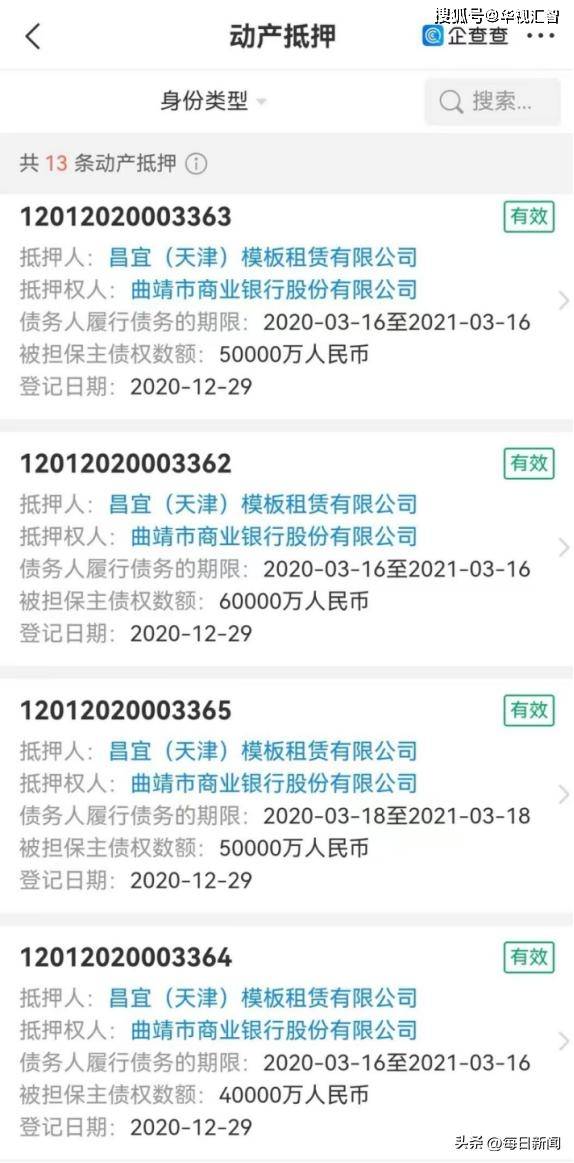 公开信息显示,曲靖市商业银行股份有限公司(以下简称:曲靖商行)曾自2020年3月16日至18日(注:计息日)质押昌宜(天津)模板租赁有限公司动产累计12次,合计发放动产抵押贷款60亿元。2021年进入诉讼程序,目前处于执行状态。