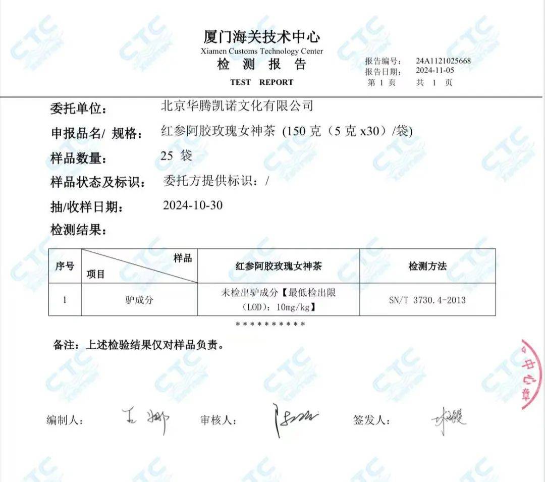 根据消费者提供的厦门海关技术中心出具的检测报告,委托人送检的样品为25袋“红参阿胶玫瑰女神茶”(150克/袋)。检测结果显示,未检出驴源性成分,最低检出限(LOD)为10mg/kg,检测方法为SN/T 3730.4-2013。