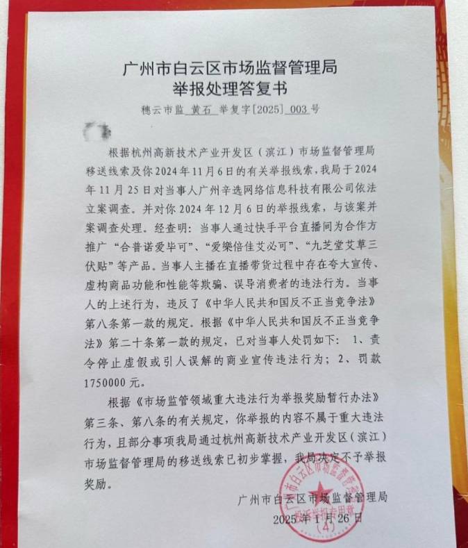 2025年2月5日下午,网络博主“桃白白style”透露,于日前收到市场监管部门出具的《举报处理答复书》,“答复书中称,经查明:当事人通过某平台直播间为合作方推广‘合普诺爱毕可’等产品,在直播带货过程中存在夸大宣传、虚构商品功能和性能等欺骗、误导消费者的违法行为,已对当事人罚款175万元。”