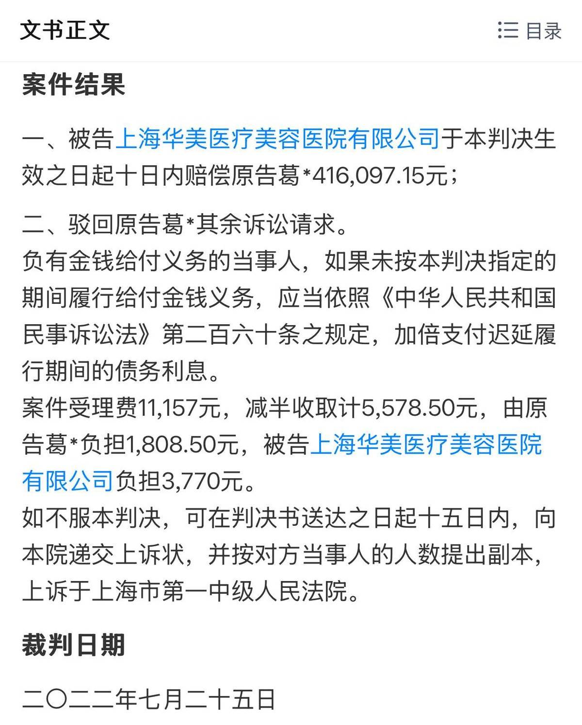 从2022年9月公布的(2022) 沪0115民初40603号裁判文书来看,也能看到该机构曾因手术失败给消费者带来无法挽回的终身痛苦。