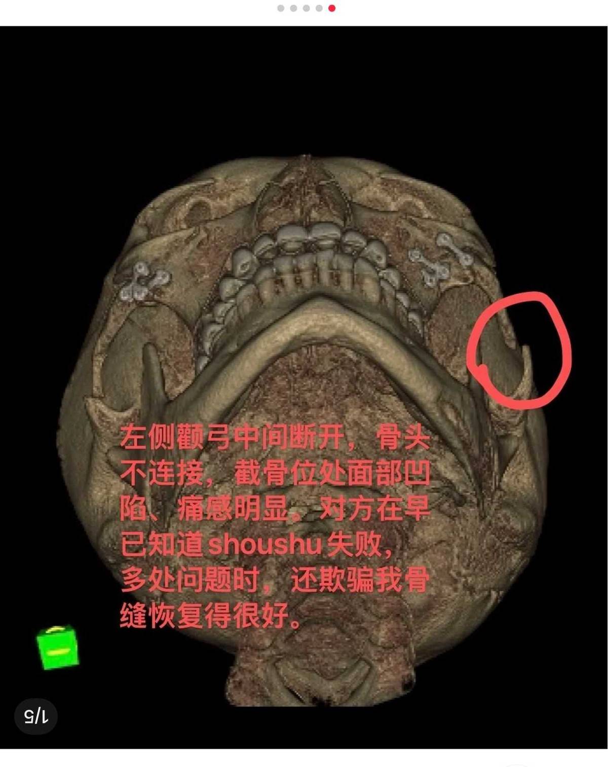 12月25日,该消费者拿着头颅三维CT片去该医院复诊,复诊过程中医生表示没有问题、一切正常,并告知骨缝愈合很好,但此时医生已经觉察到自己手术失误,骨不连、钛板钛钉脱落等问题已经显现,但仍旧选择欺瞒消费者。