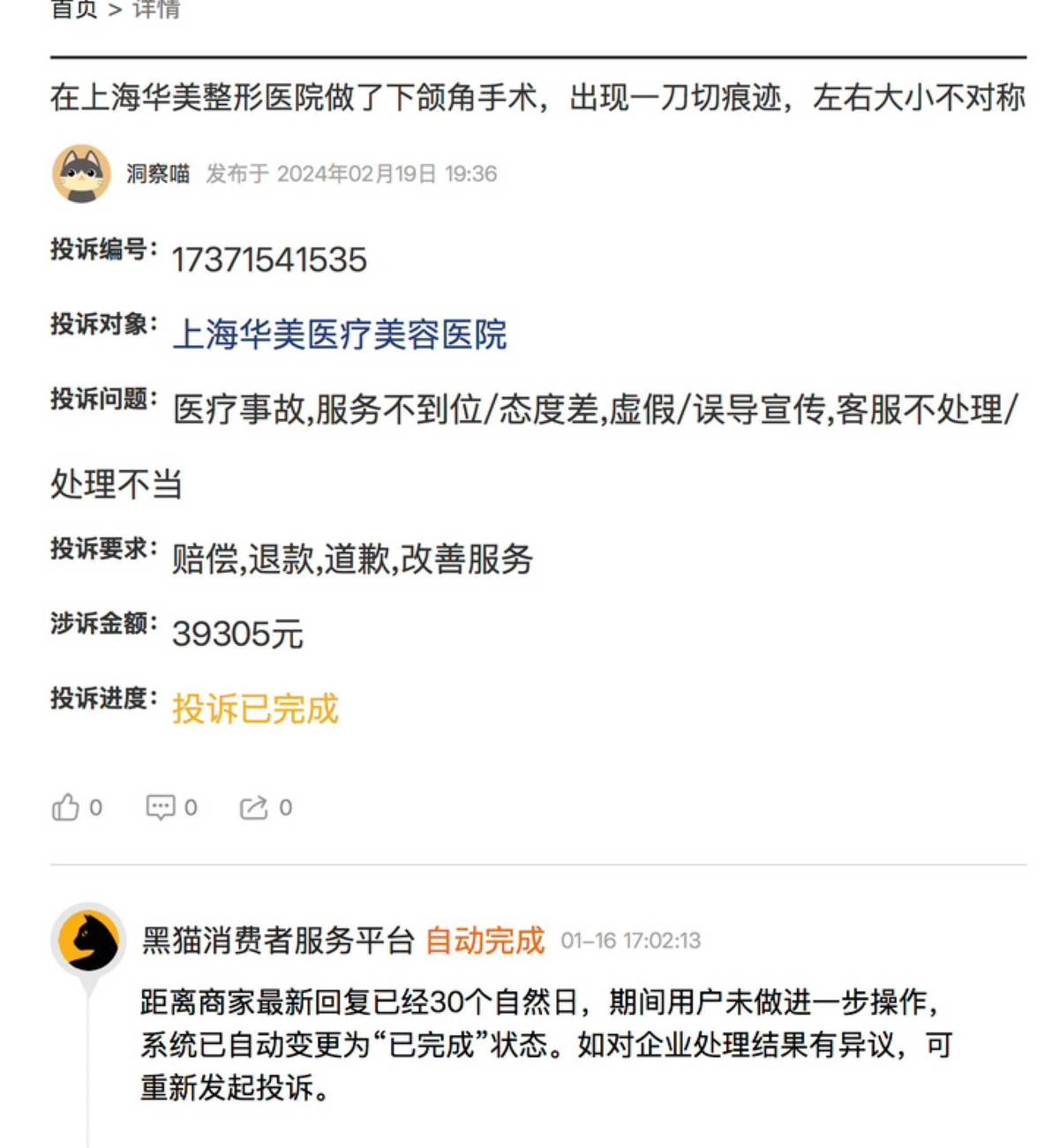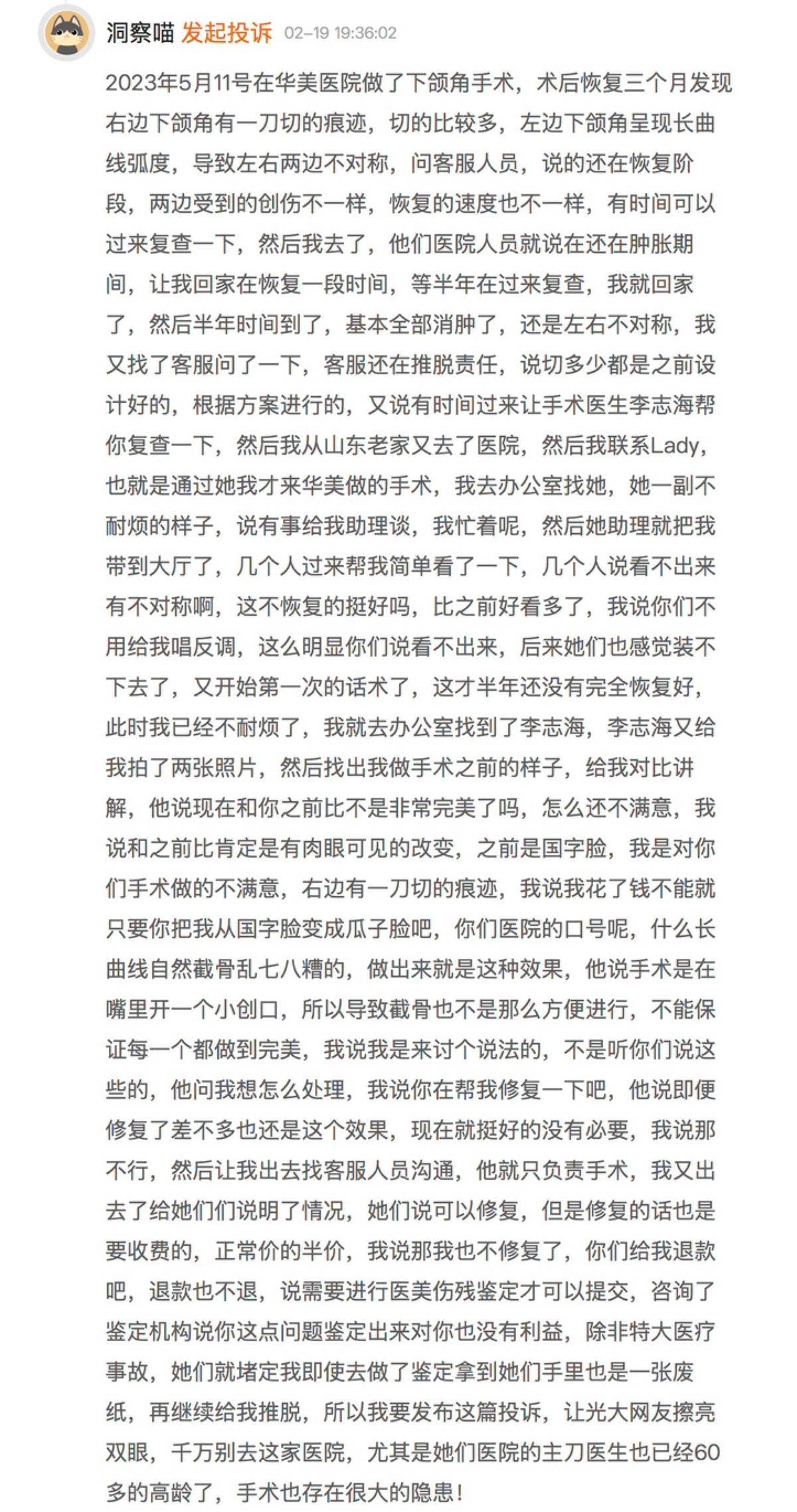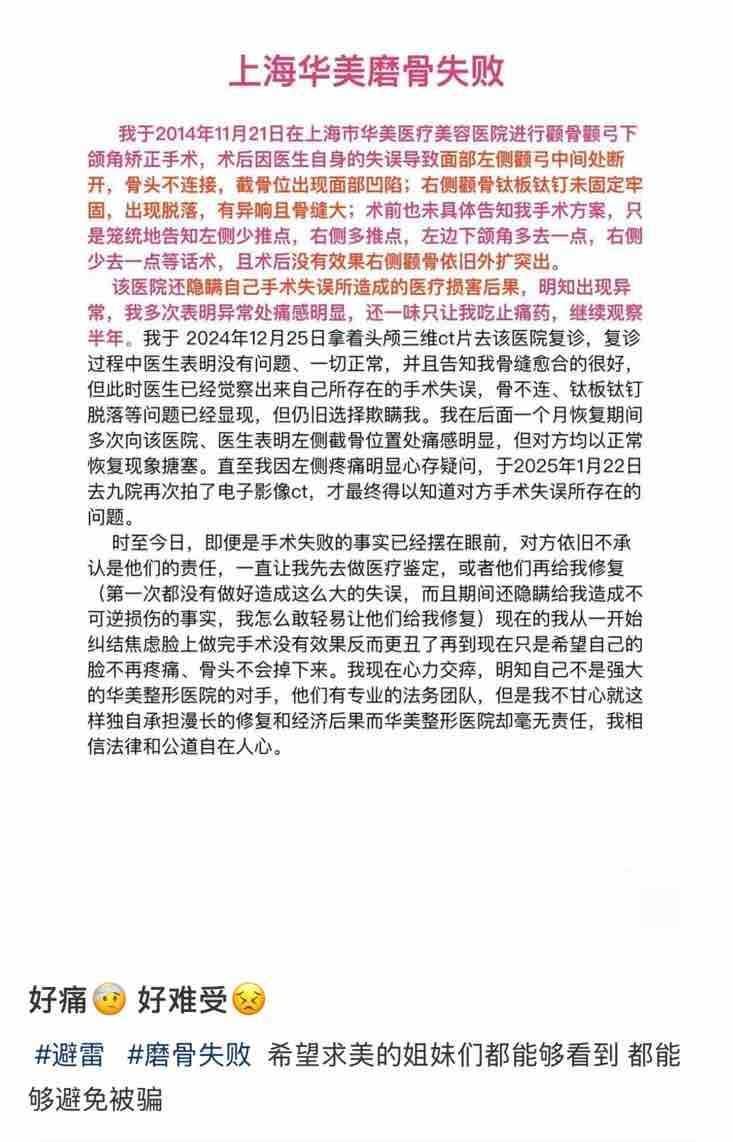 去年2月19日,有消费者在黑猫投诉平台上分享了自己在上海华美进行下颌角手术的经历。