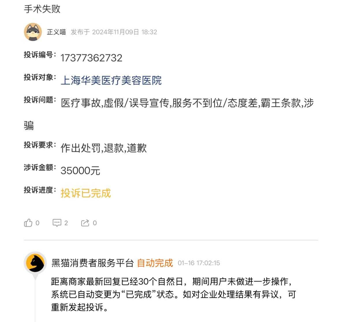 去年11月09日,有消费者在黑猫投诉平台上对上海华美医疗美容医院提出投诉,投诉问题为医疗事故、虚假/误导宣传、霸王条款、涉骗等。投诉要求为作出处罚、退款、道歉,涉诉金额为35000元,截至深度美业发稿前,因消费者未进行下一步确认,所以投诉进度显示为已完成。
