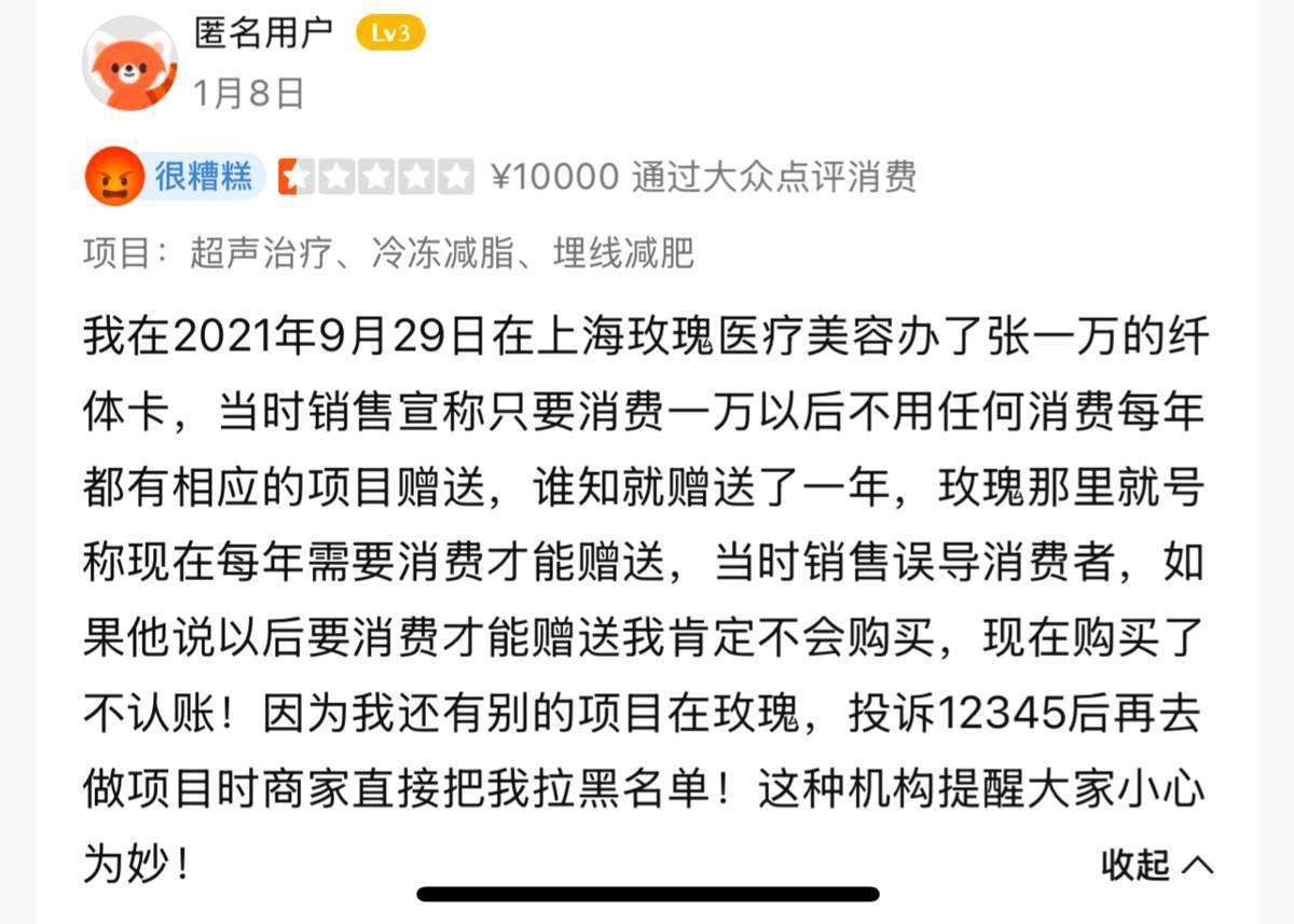 1月8日,另一位消费者同样在大众点评对上海玫瑰医疗美容医院进行了0.5星的差评。该消费者对超声治疗、冷冻减脂、埋线减肥的项目表示不满。他们在2021年9月29日在上海玫瑰医疗美容医院办理了一张价值一万元的纤体卡,当时销售人员宣称只要消费一万元,以后每年都会有相应的项目赠送。然而,该消费者发现这个赠送政策只持续了一年,之后需要再次消费才能获得赠送。该消费者认为销售人员误导了消费者,如果知道需要再次消费才能获得赠送,他们就不会购买。该消费者还提到,由于还有别的项目在玫瑰,投诉12345后再次去做项目时,商家直接把他们拉入黑名单。这位消费者提醒大家要小心这家机构。
