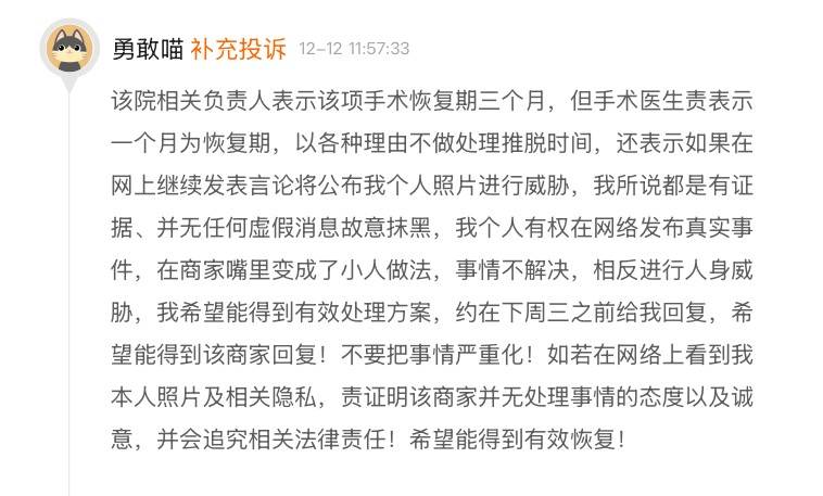 此外,该消费者还提到,如果在网上继续发表言论,医院将公布其个人照片进行威胁。他强调自己所说的都是有证据的,并且没有任何虚假信息。他有权在网络发布真实事件,希望得到有效处理方案,并在下周三之前得到回复。如果在网络上看到其个人照片及相关隐私,他将追究相关法律责任。