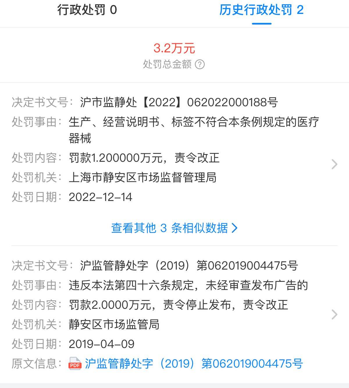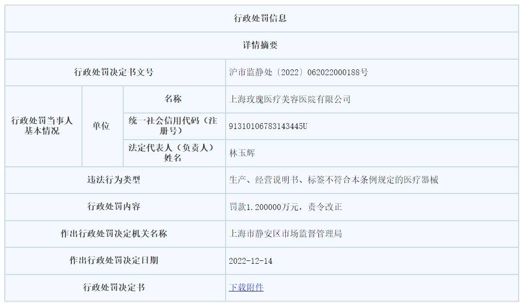 2022年12月22日,上海玫瑰医疗美容医院有限公司因生产、经营说明书、标签不符合规定的医疗器械,被上海市静安区市场监督管理局处以1.2万元的罚款并责令整改。