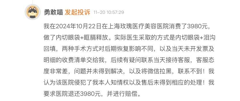 去年11月20日,有消费者在黑猫投诉平台控诉上海玫瑰医疗美容医院。该消费者表示,他在2024年10月22日在上海玫瑰医疗美容医院消费了3980元,进行了内切眼袋和眶膈释放手术。然而,实际手术过程中,医生采取的是内切眼袋加泪沟回填的方式,与消费者预期的手术方式不同,且对后期恢复有不同影响。此外,消费者指出,医院当天没有提供发票和明细收费清单,客服态度差,问题未得到解决,甚至被拉黑,无法再次联系。