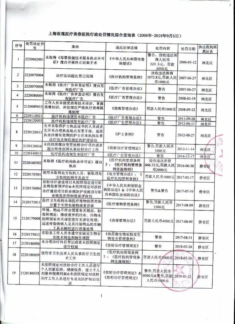 2019年11月,南方都市报记者查询彼时的“信用中国”数据显示,在过去的14年间,上海玫瑰美容医院所涉及的行政处罚超过40宗,违法内容五花百门,较为频繁违法的内容包括未取得医疗执业许可擅自执业,使用非卫生技术人员从事医疗卫生技术工作、诊疗活动超出登记范围,以及对商品功能等作引人误解的虚假宣传等。