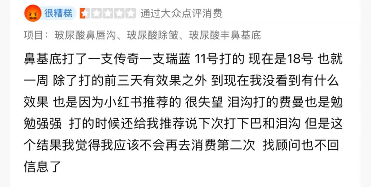 1月18日,有消费者在大众点评对上海玫瑰医疗美容医院进行了0.5星的差评。该消费者对玻尿酸鼻唇沟、玻尿酸除皱、玻尿酸丰鼻基底的项目表示了极度的不满。他们提到鼻基底打了一支传奇和一支瑞蓝,除了注射后的前三天有效果外,之后并没有看到任何改善。该消费者是因为小红书的推荐而选择了这家医院,但结果让他们感到非常失望。此外,他们还提到泪沟注射的费曼效果也仅仅是勉强,而且注射时还被推荐下次进行下巴和泪沟的注射。由于这次体验的结果,该消费者认为自己不会再去消费第二次,而且尝试联系顾问也未得到回复。