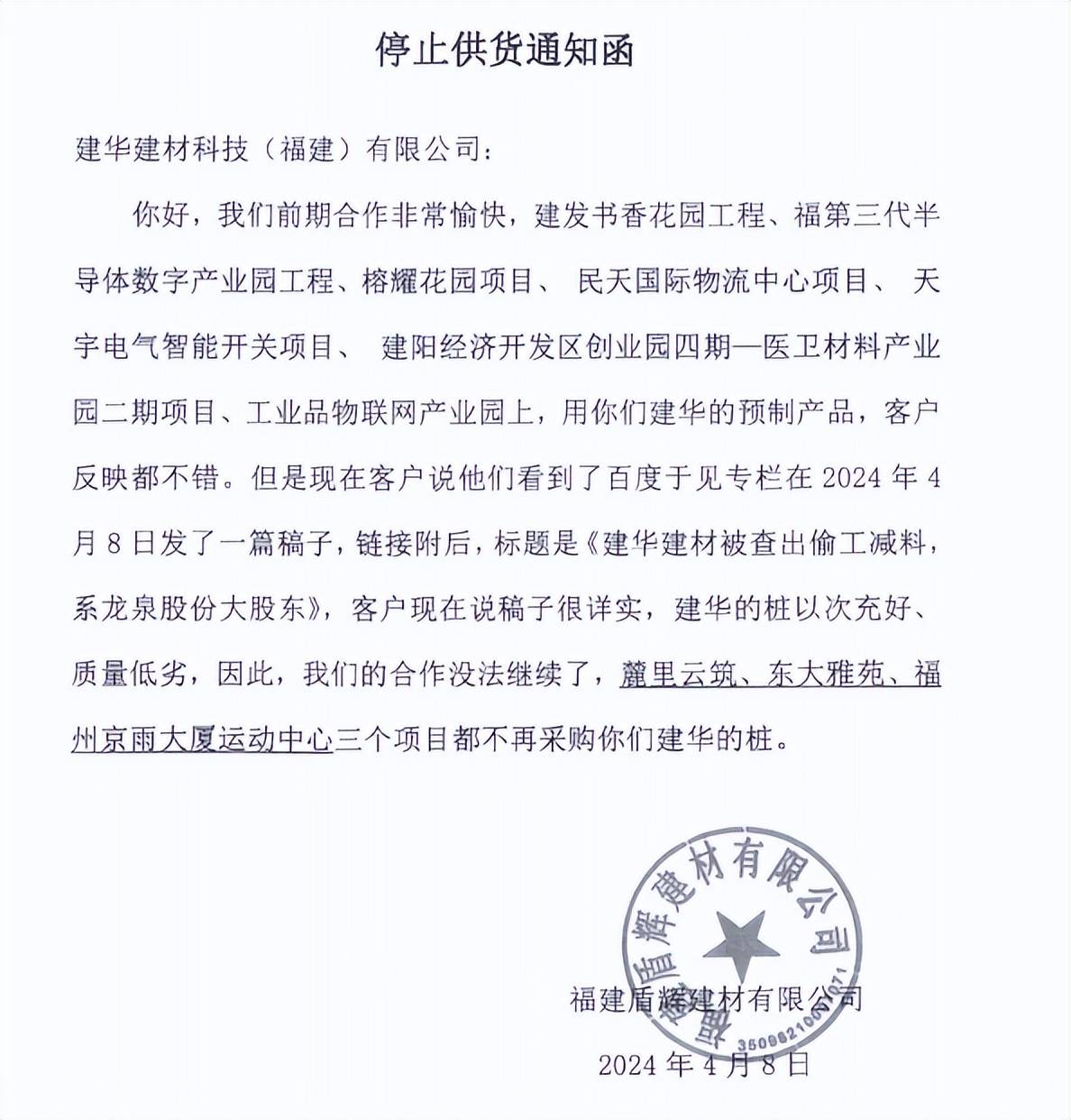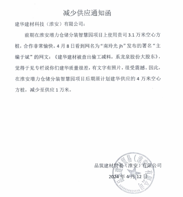 但是,在建华建材出示的落款为品筑建材贸易(淮安)有限公司的《减少供应通知函》证据中,直指原因是这篇文章以及其署名的作者,且细节描述十分清楚,把这篇文章与其减少供应之间的关系,说得如此坚决肯定,不得不让人生疑,其合作企业如此作为,背后的实际动机到底为何。