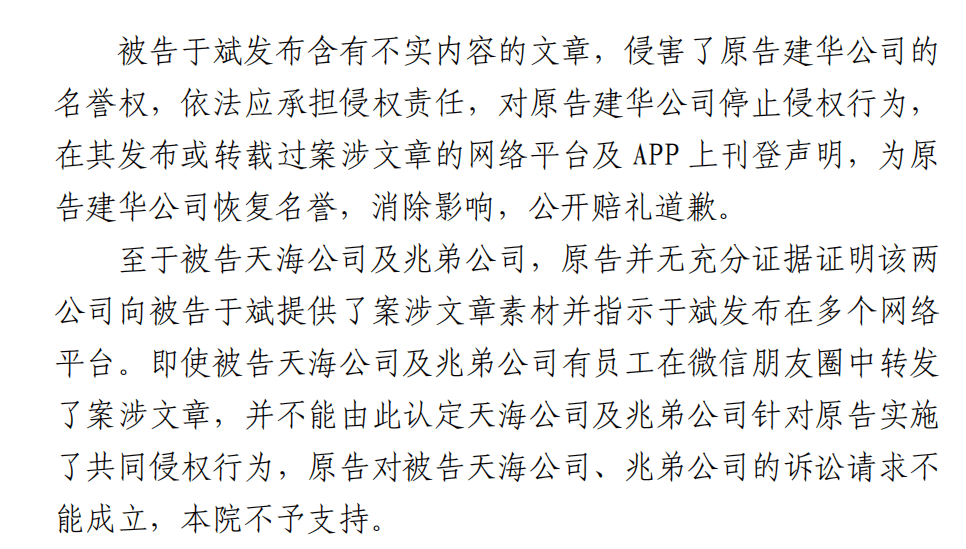 而且,该篇文章也被指是两家公司联合「于见专栏」所为。因此,这两家公司也一同坐上了被告席。