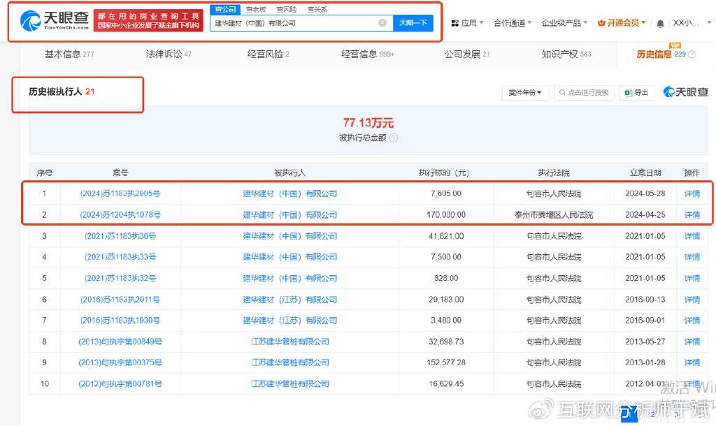 根据天眼查信息显示,2024年,建华建材(中国)有限公司两次成为被执行人,历史被执行人21次。