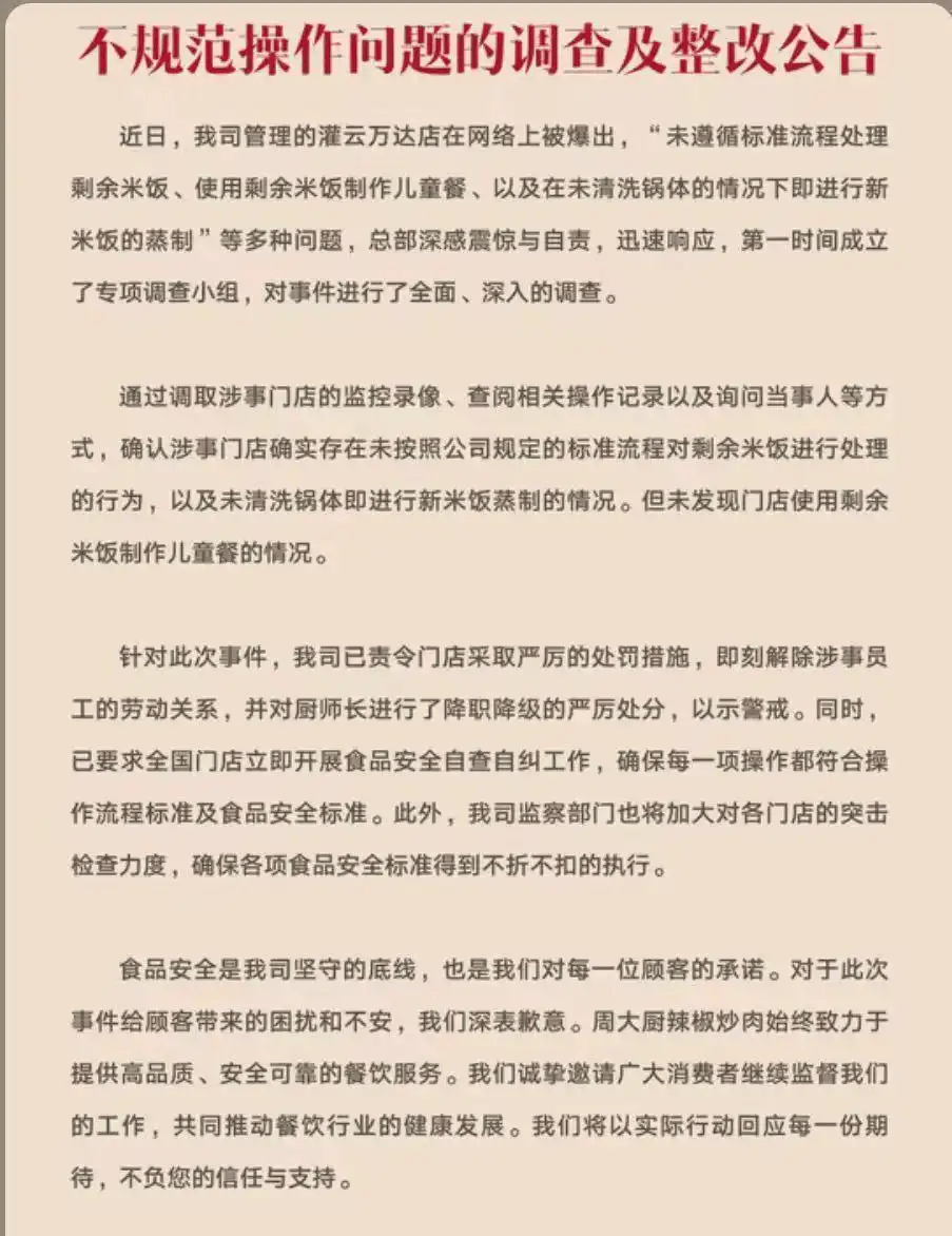 针对此次事件,公司已责令门店即刻解除涉事员工的劳动关系,并对厨师长进行了降职降级的严厉处分,同时已要求全国门店立即开展食品安全自查自纠工作。此外,公司监察部门也将加大对各门店的突击检查力度。