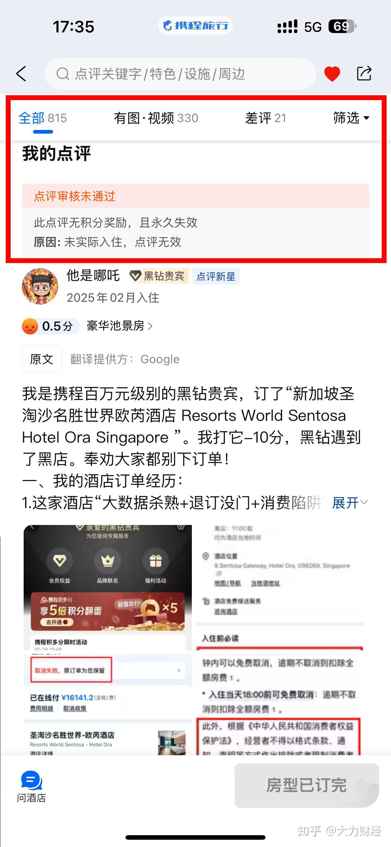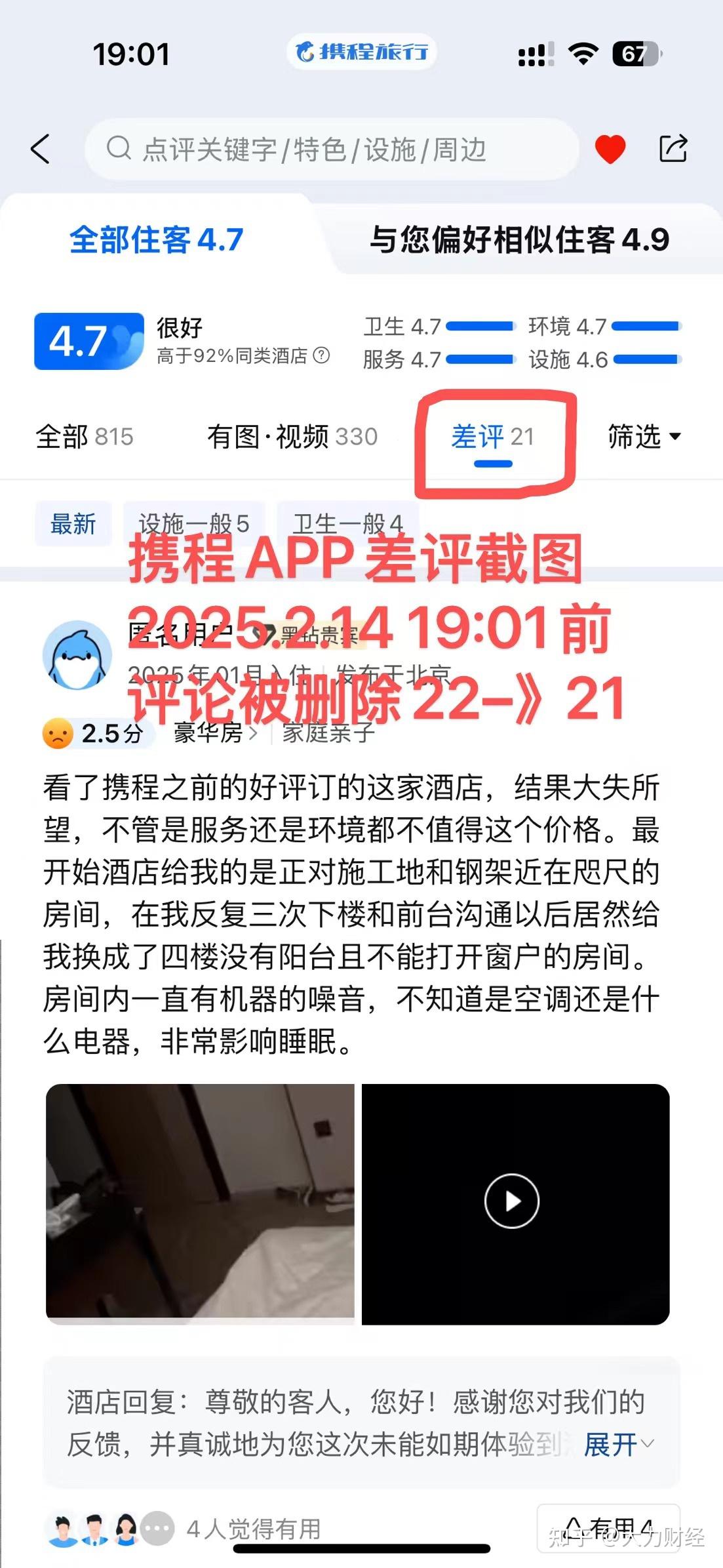 据大力财经的持续关注,最新的动态是,酒店没有及时跟进处理,把在携程的点评帖子,差评贴都给删除了。