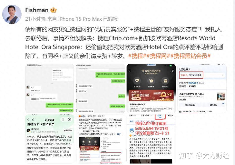 知名游戏人渔夫Fishman作为携程百万元级黑钻会员,因新加坡圣淘沙酒店订单纠纷引发的退订难、价格争议及差评删除事件,不仅暴露了携程在服务机制、平台监管和用户权益保障上的多重漏洞,更引发了对行业龙头企业服务能力的系统性质疑。