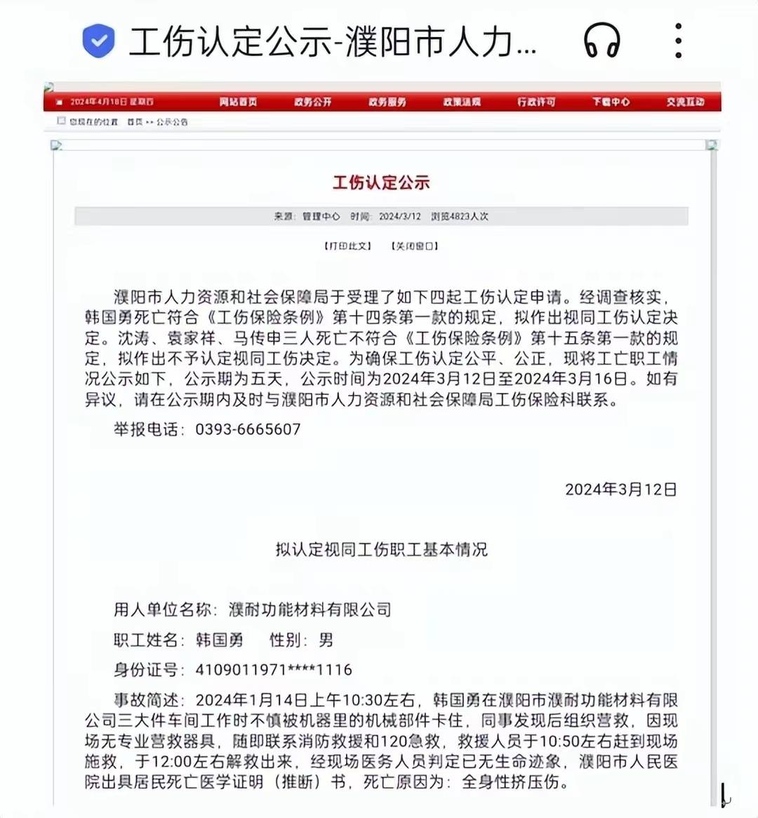 河南省濮阳市人力资源和社会保障局2024年3月12日出具的工伤认定公示显示韩国勇死亡符合《工伤保险条例》第十四条第一款的规定,拟作出工伤认定决定。”