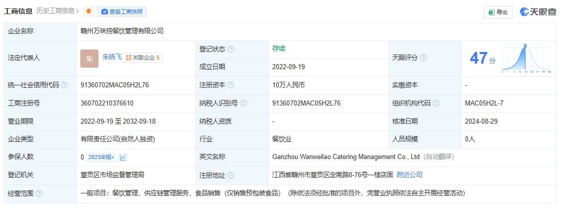 天眼查显示,赣州万味捞餐饮管理有限公司成立于2022年9月19日,注册资本为10万元,法人代表为朱统飞。经营范围包括:餐饮管理,供应链管理服务,食品销售(仅销售预包装食品)(除依法须经批准的项目外,凭营业执照依法自主开展经营活动)。2024年7月2日,该公司因未按规定提交年度报告信息而被列入企业经营异常名录。