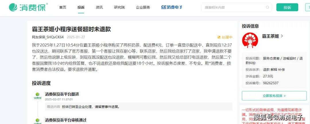 沈阳的赵女士日前投诉称,她在霸王茶姬小程序上购买了两杯奶茶,但订单一直显示“配送中”,近两个小时仍未送达。期间,赵女士联系了官方客服。第一位客服让赵女士耐心等待,并建议她联系店家。赵女士随后联系店家并申请退款,但店家表示需向上级反映,之后既没有配送也没有退款,态度模糊且敷衍。