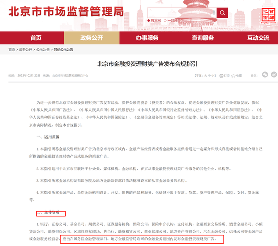 以北京为例。2023年2月,北京市市场监督管理局发布的《北京市金融投资理财类广告发布合规指引》特别强调了“主体资质”。
