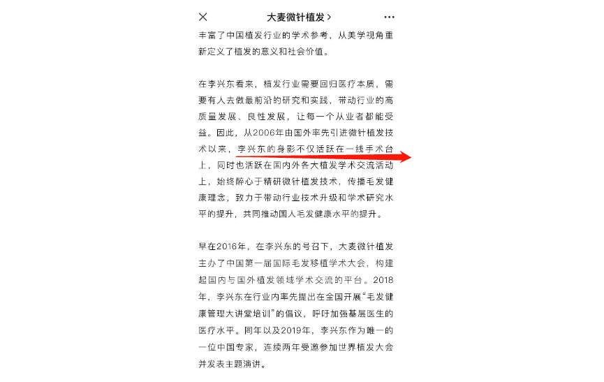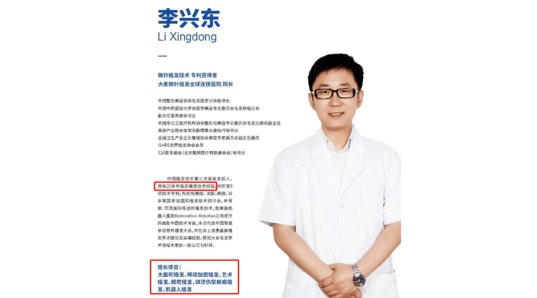 我们从官方公号“大麦微针植发”还进一步查探到有力佐证。2020年,该公号发文表示,“自2006年由国外率先引进微针植发技术以来,李兴东的身影不仅活跃在一线手术台上,同时也活跃在国内外各大植发学术交流活动上”,加上其本人简介中的“拥有20多年临床植发技术经验”来看,李兴东擅长项目中包含多项植发相关手术内容。