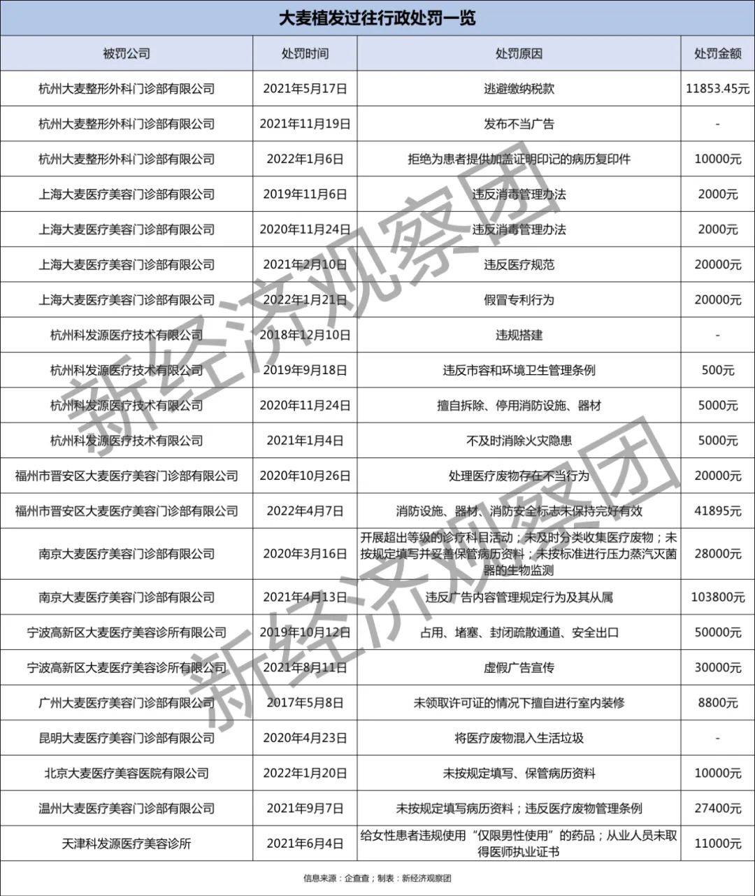 根据企查查数据,在大麦植发旗下多家医疗机构之中,关联风险下的行政处罚已超过20余条。