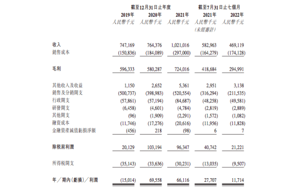 飙升的营销开支,也不断侵蚀着大麦植发的盈利能力。因此尽管营收仍在缓慢增长,但公司毛利率已经逐渐下滑:由2019年的79.8%下降至2020年的75.9%,到2021年,这一数字再次下滑至70.9%。截至2022年7月31日,大麦植发整体毛利率已经降至62.9%。与三年前相比,直接下降了近17个百分点。