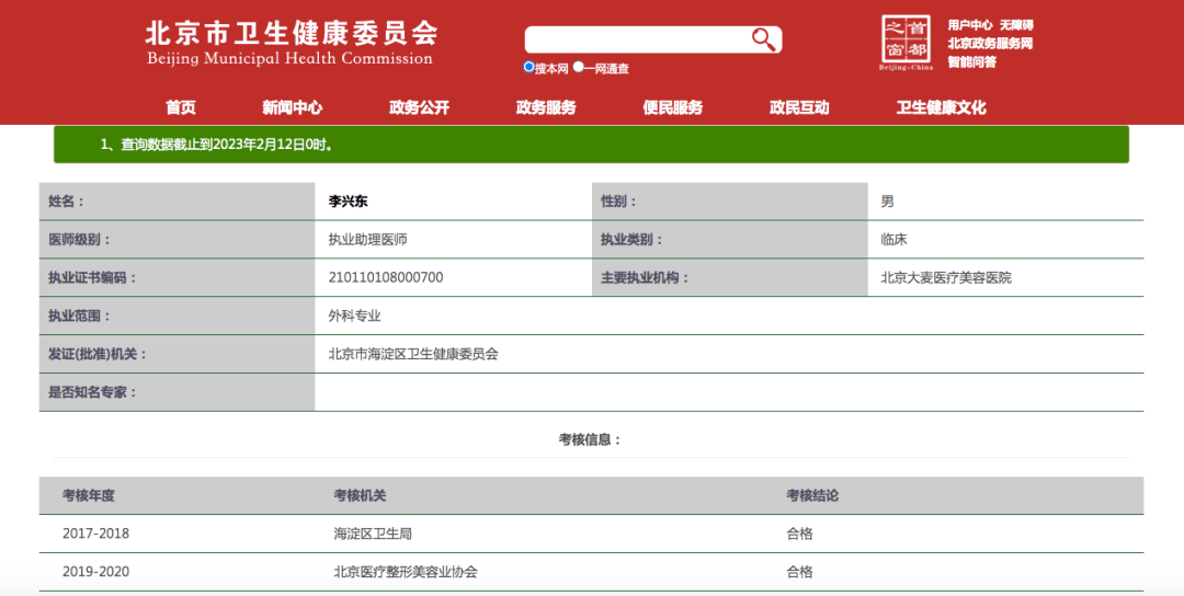 最新的《医师执业注册管理办法》第十七条明确规定,“执业助理医师只能注册一个执业地点”。截至2023年2月13日,北京卫健委官网显示,李兴东的医师级别仍为执业助理医师。这意味着至少在公开记录的2013年之后,李兴东在其他省市始终不具备其他从业资格。