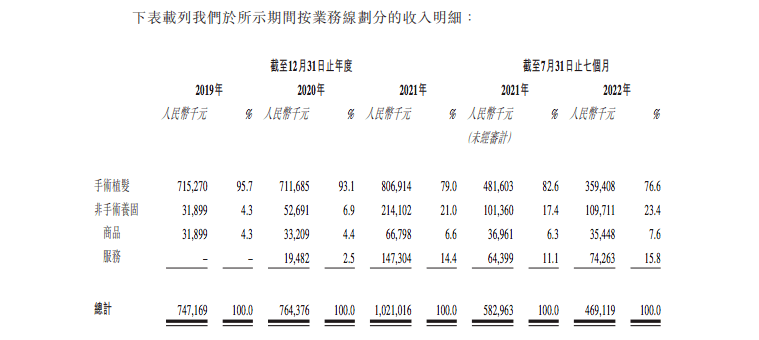 毛利率的下滑也与大麦植发的业务结构变化密切相关。根据招股书,大麦植发的主营业务包括手术植发、非手术养固、商品、服务等。其中手术植发毛利率较高,近年来始终维持在60%-80%之间,也就是说这部分业务的营收占比越大,公司整体毛利率才能越高。然而事与愿违,手术植发近年来占比却不断下滑,报告期内营收占比分别为95.7%、93.1%、79%、76.6%。而毛利率较低的非手术养固业务却快速增长,报告期内营收占比达到了4.3%、6.9%、21%、23.4%,间接拉低了公司的整体毛利率水平。