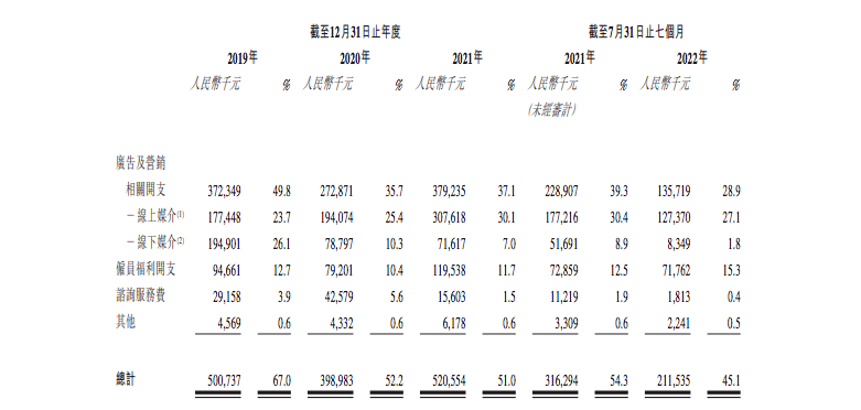 每况愈下的经营业绩,与高额的营销开支脱不开关系。招股书显示,2019-2022年前7个月,大麦植发营销开支分别达到5亿元、3.99亿元、5.21亿元、2.12亿元,占比营收达到67%、52%、50%、45%。也就是说三年多时间里,营销开支累计已达16.3亿元,甚至占据了整体营收的半壁江山。
