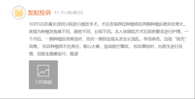 2021年11月15日,有消费者投诉表示,自己在10月5日深圳雍禾植发做的植发手术,术后发现种植师两侧种植区差异非常大,具体表现为种植发角度不同,疏密不同,长短不同。本人依照院方术后保养要求进行护理。一个月后,一侧种植区效果良好,而另一侧则出现头发生长混乱,存活率低,并伴有“斑秃”的效果。该消费者投诉种植师不负责任,粗心大意,造成医疗事故。投诉复检时,向医生进行反馈,医生也应付推诿。