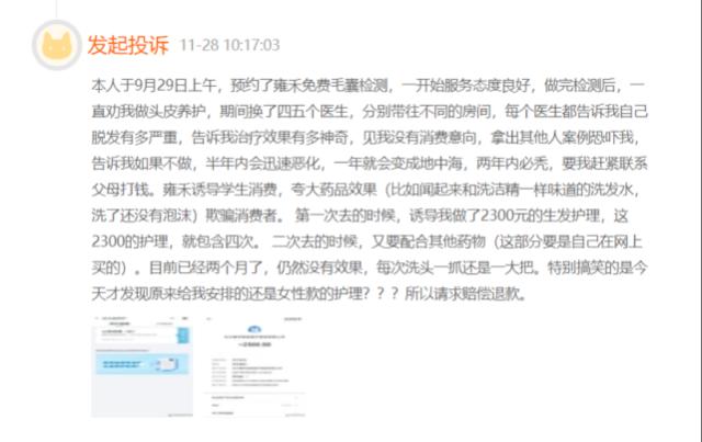2021年11月28日,有消费者投诉表示,自己于9月29日预约的雍禾免费毛囊检测。做完检测后,院方一直推荐自己做头皮养护,期间换了四五个医生,分别带往不同的房间,医生都告诉自己脱发严重、治疗效果神奇。当看见自己没有消费意向时,医生便拿出其他人的案例恐吓我。告诉我如果不做,半年内会迅速恶化,一年就会变成地中海,两年内必秃。由于自己是学生,雍禾植发便要求自己联系父母打钱。