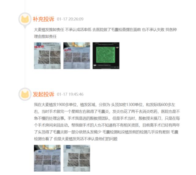 另一位消费者投诉称,自己在大麦微针植发做完手术后一星期左右就得了毛囊炎,院方处理态度不紧不慢。手术过程当中,自己选择的主治医生团队并未操刀,也不确定做手术的医护人员是否具备相关资质。距自己做完植发手术已经过去两年的时间,而自己患毛囊炎的那一部分头皮依然头发稀少,毛囊检测和没植发前几乎没有差别,大麦植发方推卸责任,不承认植发成活率低。