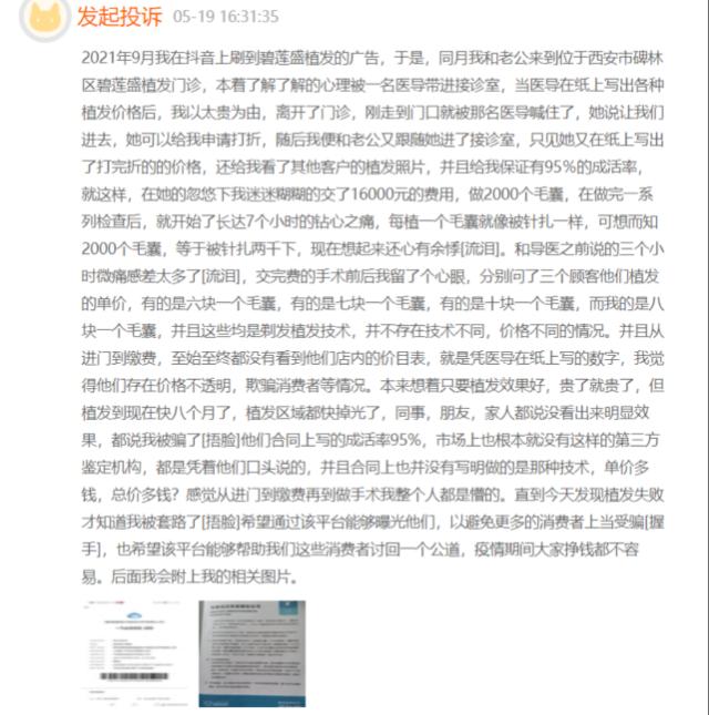 同样作为民营植发巨头,碧莲盛植发也因定价不透明遭遇消费者的投诉。2022年5月19日,有消费者投诉表示,自己曾在一年前的9月来到西安市碑林区碧莲盛植发门诊,在和医导沟通后,医导以可以申请打折为由,保证植发成活率95%,诱导自己交了16000元的植发费用,做2000个毛囊。植发手术的过程,该消费者遭受了钻心之痛,每一个毛囊就像被针扎一样,直至现在还心有余悸。自己在做手术之前还曾询问一同植发的顾客手术费用情况,顾客们回答的植发价格均不统一。此外,自从进门到缴费并未看见院内的价目表,仅凭医导在纸上定价,该消费者表示碧莲盛存在定价不透明、欺骗消费者等情况。