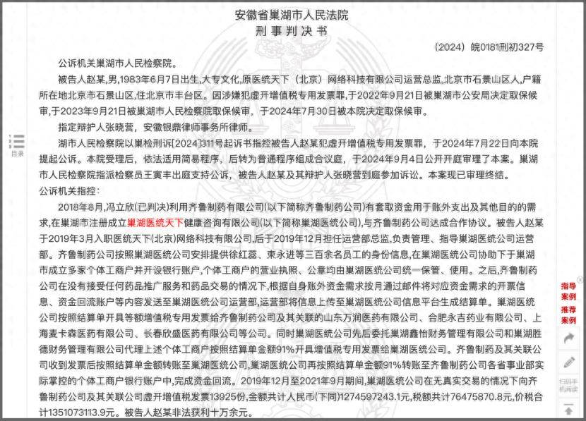 该判决书披露的核心内容是:“2019年12月至2021年9月期间,巢湖医统天下健康咨询有限公司(以下简称‘巢湖医统天下’)在无真实交易的情况下,向齐鲁制药有限公司(以下简称‘齐鲁制药’)及其关联公司虚开增值税发票13925份, 价税合计13.51亿元。”
