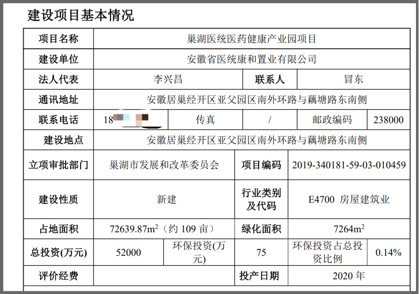 据2019年8月编制的巢湖医统医药健康产业园项目建设项目环境影响报告表,文件中披露的项目信息与此前披露的信息有一定的出入,该项目的实际建设单位为安徽省医统康和置业。这是冯某欣和北京医统天下实际控制的子公司。记者电话联系安徽省医统康和置业联系人,电话未能接通。