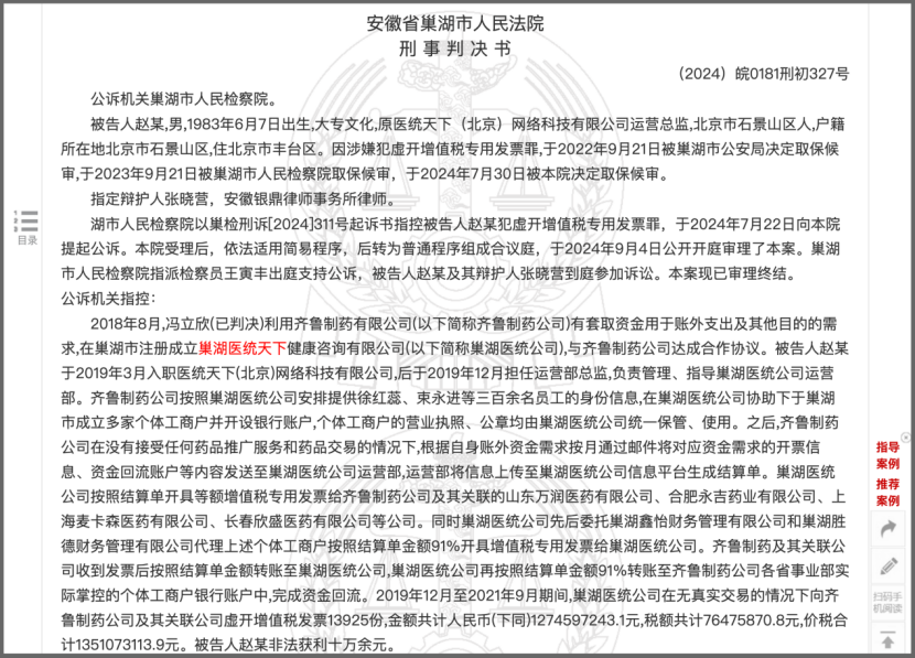 该判决书披露的令人震惊的核心内容是:“2019年12月至2021年9月期间,巢湖医统天下健康咨询有限公司(以下简称‘巢湖医统天下’)在无真实交易的情况下,向齐鲁制药有限公司(以下简称‘齐鲁制药’)及其关联公司虚开增值税发票13925份,价税合计13.51亿元。”
