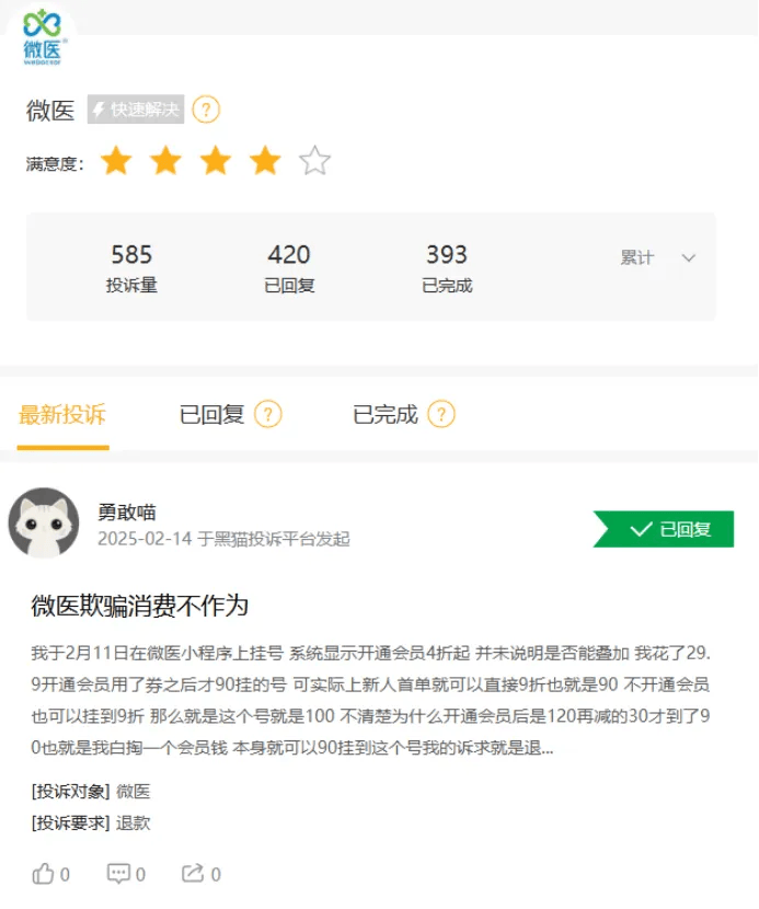 在消费者端,在黑猫投诉平台上,截至2月20日,微医的投诉有585条,已完成393条,不少消费者投诉微医有自动续费、退款难、存在欺骗行为等。