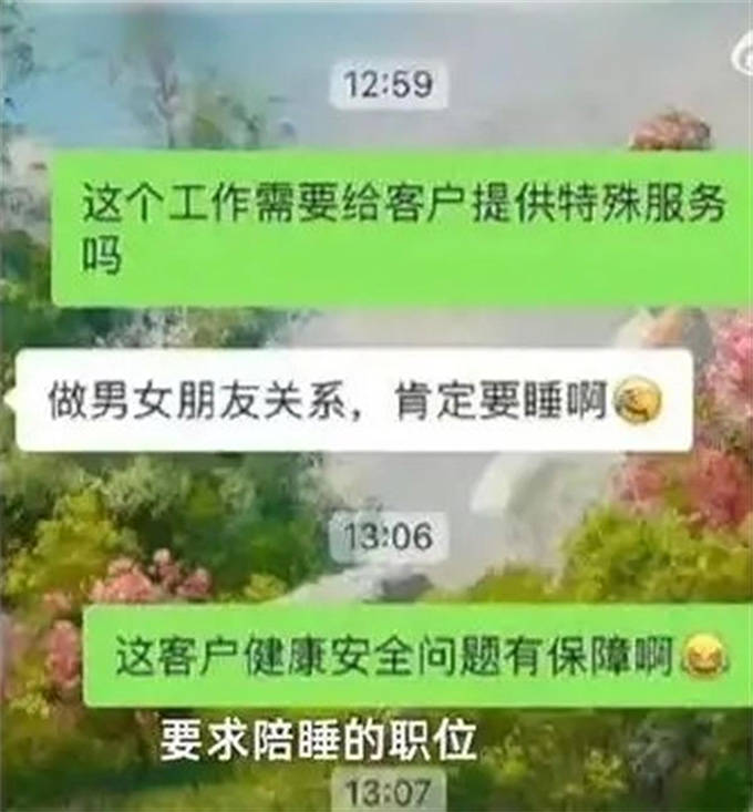 该公司HR表示如果可以接受,一个月能拿几万块钱,“提供的公寓你自己住,经理有时候晚上也会过去”。随后要求求职者穿丝袜上班,给老板拍视频、发照片挑逗。