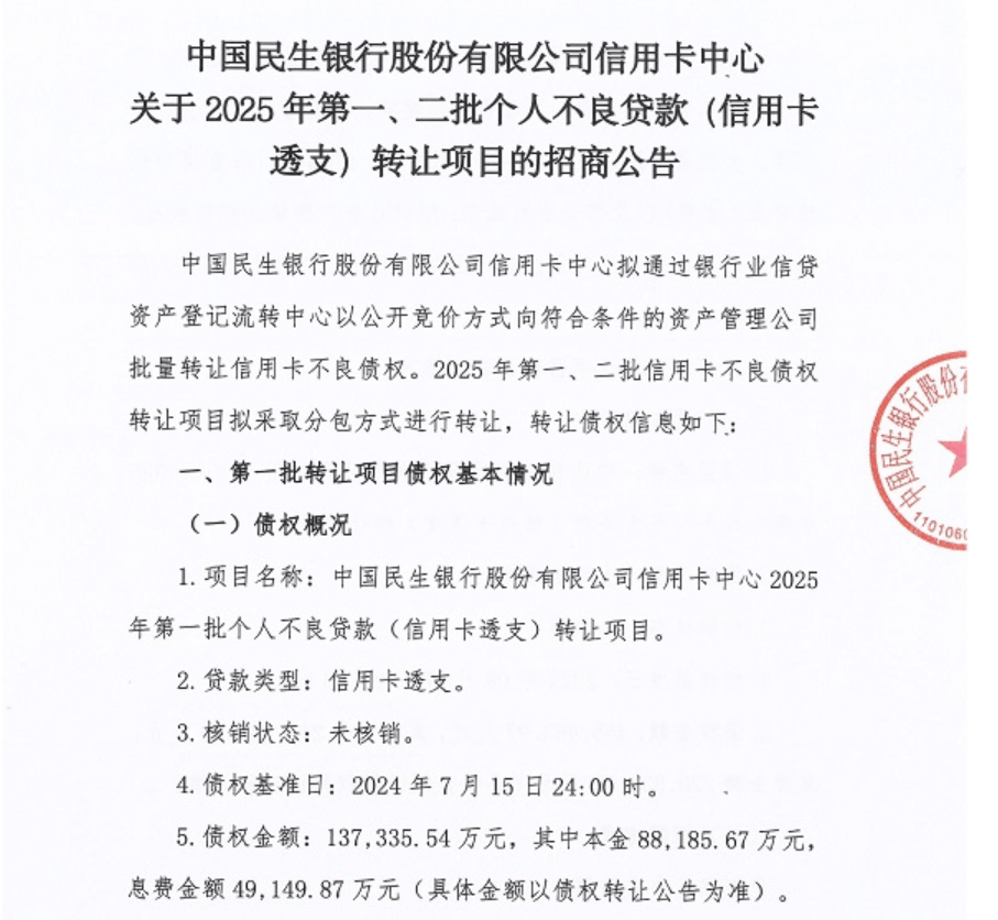 2月20日,民生银行信用卡中心发布公告称,该行拟以公开竞价方式批量转让信用卡不良债权,2025年第一批和第二批个人不良贷款(信用卡透支)债权金额共计60.28亿元,其中,本金33.31亿元,息费金额26.96亿元;共涉及不良债权88819笔,债务人85117户。