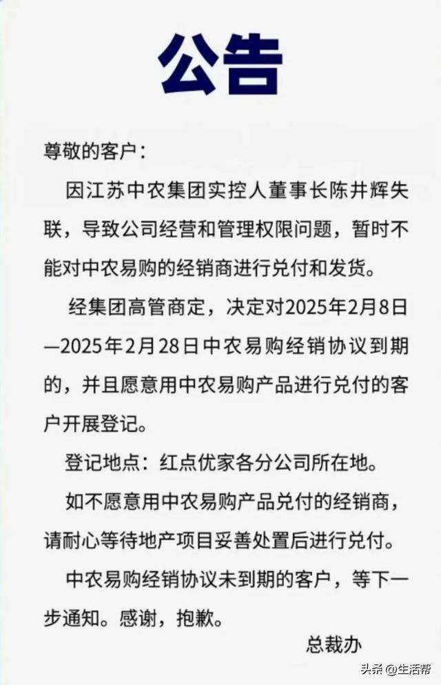 近日,网上流传一则公告称,江苏中农集团董事长陈井辉失联,导致公司经营和管理权限出现问题,暂时不能对中农易购的经销商进行兑付和发货。