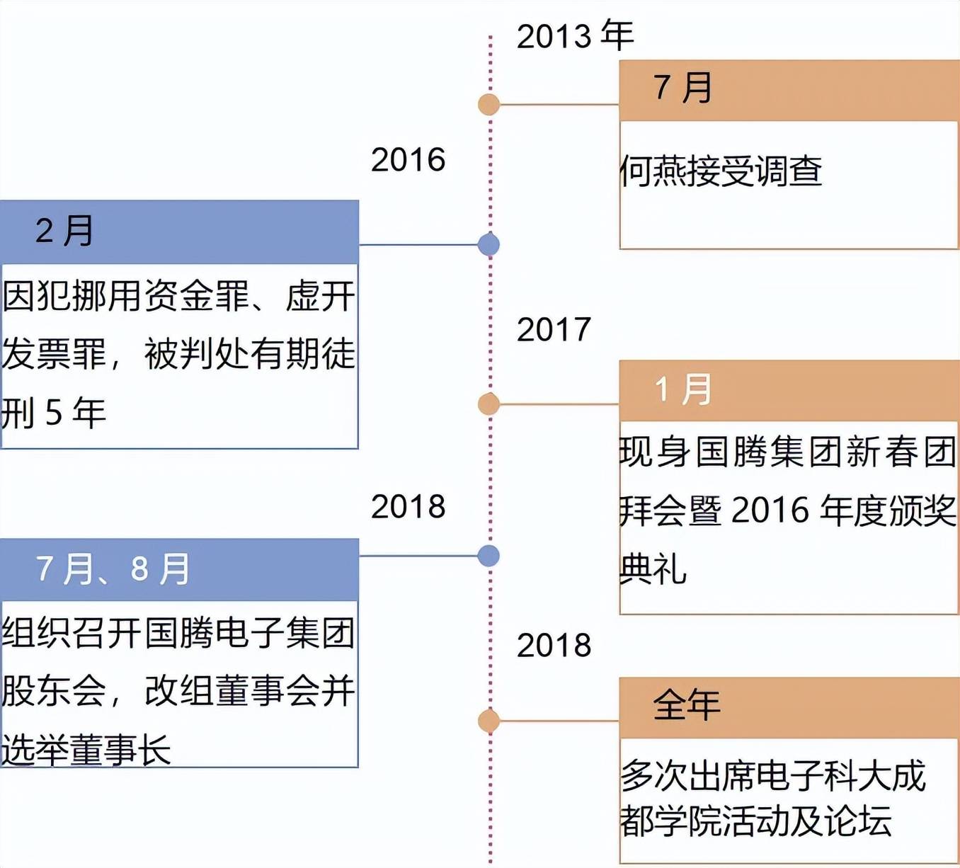 2017年1月13日,国腾集团举行了隆重的新春团拜会暨2016年度颁奖典礼,何燕意外现身,当时她的身份是国腾集团董事长。