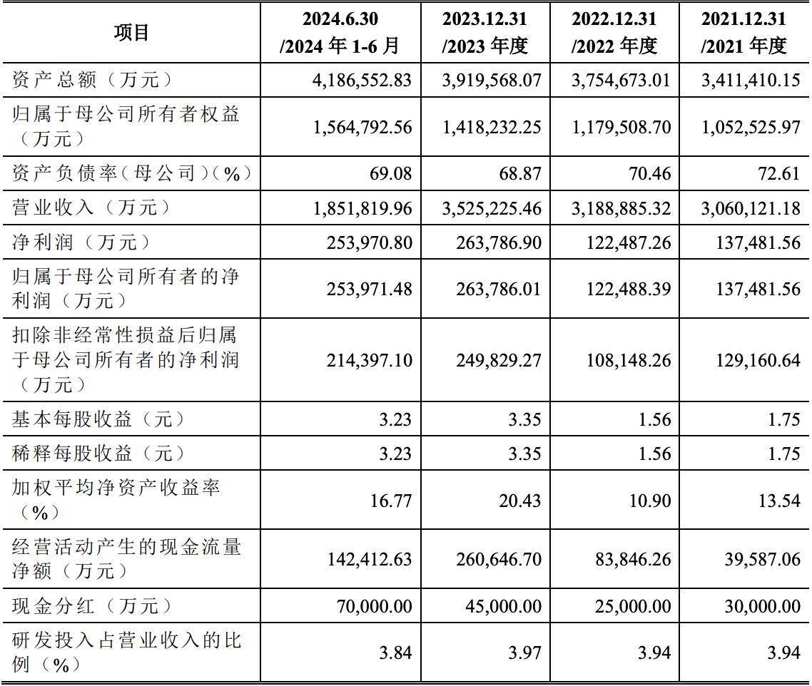 2021年、2022年、2023年和2024年上半年,中策橡胶的营收分别约306.01亿元、318.89亿元、352.52亿元和185.18亿元,净利润分别约13.75亿元、12.25亿元、26.38亿元和25.40亿元,扣非后净利润分别约12.92亿元、10.81亿元、24.98亿元和21.44亿元。