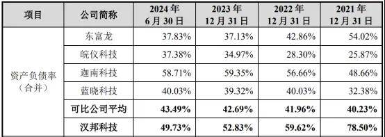 更令人担忧的是,汉邦科技的资产负债率长期居高不下。2021年至2024年上半年,其资产负债率分别为78.50%、59.62%、52.83%、49.73%,远高于同行业可比公司40%的平均水平。如此高的负债率,意味着公司面临着巨大的偿债压力和财务风险。