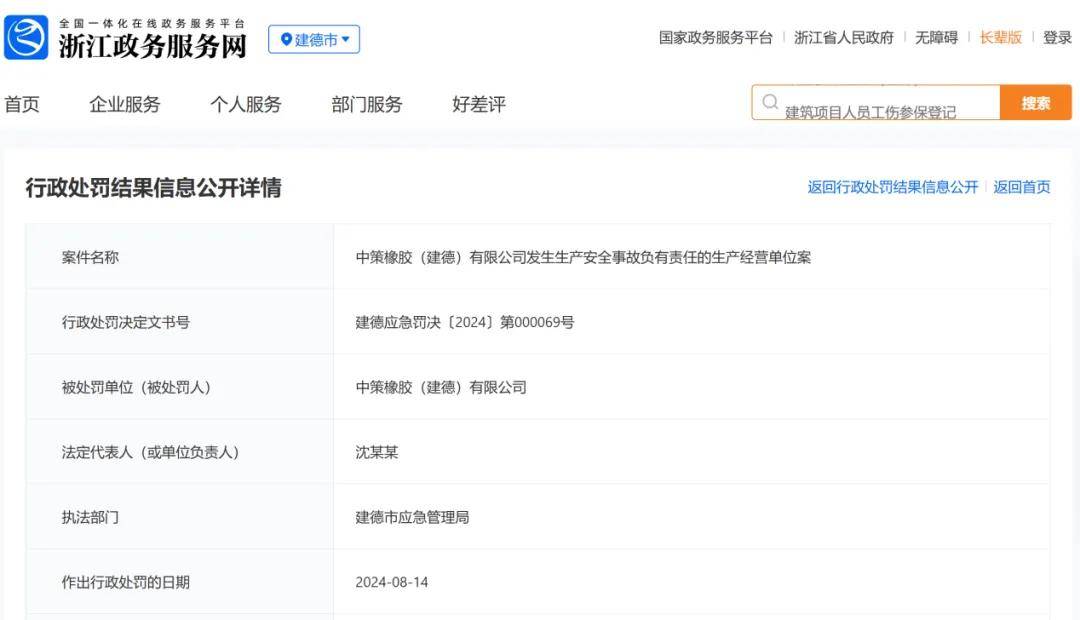 2024年3月14日,中策橡胶(建德)有限公司发生了一起安全事故。一名员工在机器处于自动运行状态下,贸然穿越传递环,结果遭受机械伤害,最终不幸身亡。5个月后,建德市应急管理局依据相关法律法规,对中策建德处以55万元罚款的行政处罚。