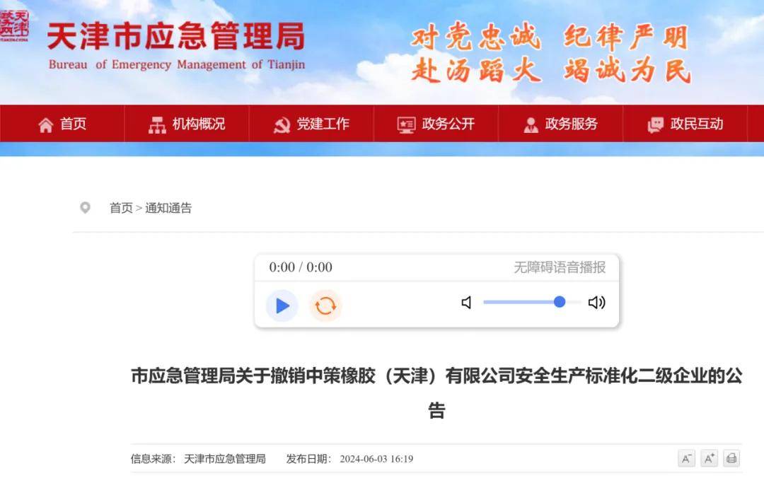 祸不单行,2024年5月29日,中策橡胶(天津)有限公司再次发生一起机械伤害事故,同样造成1人死亡。这起事故的后果更为严重,天津市应急管理局依据《企业安全生产标准化建设定级办法》,撤销了中策天津工贸行业安全生产标准化二级企业等级。这意味着中策天津将无法再享受相关激励政策,对其未来发展产生了直接的负面影响。
