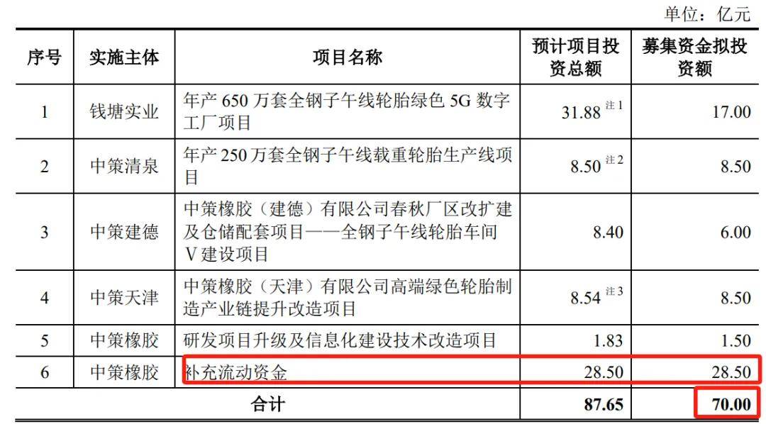 面对上交所的问询,中策橡胶解释称,补充流动资金是为了满足未来三年公司业务规模增长带来的日常营运资金需求。然而,在最新版招股说明书中,公司却将募集资金总额从70亿元降至48.5亿元,并直接删除了28.5亿元的补流项目。